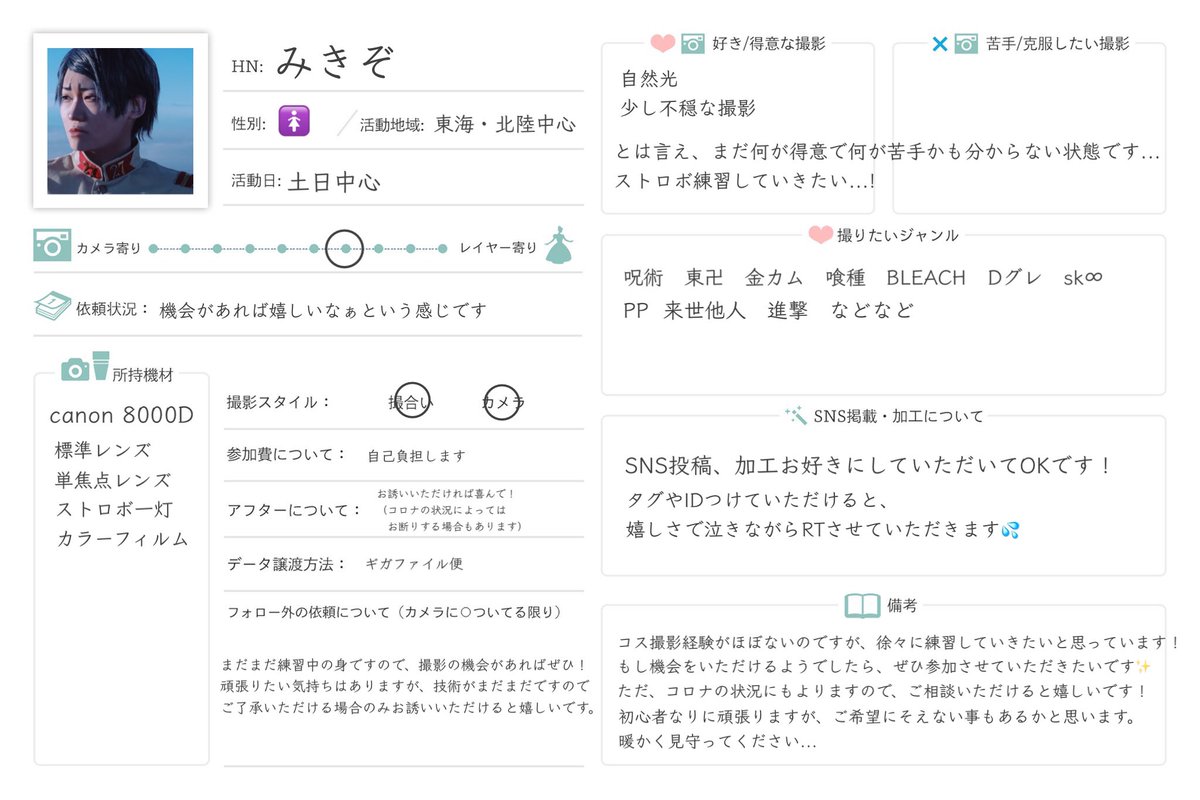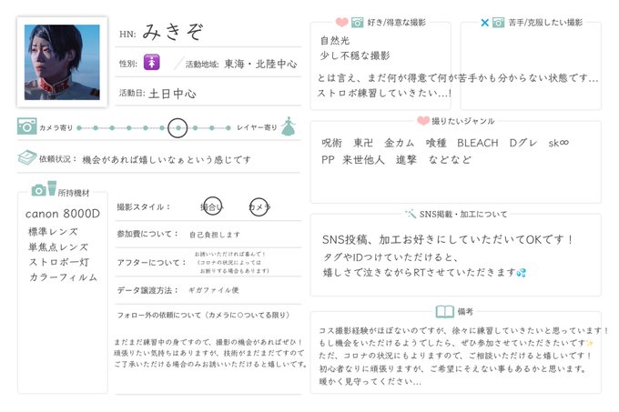 少しずつ📷の技術を伸ばして行きたいので、 思い切ってタグ失礼します🔰🙏 コス撮影ほぼ経験ありませんが... 1枚目三脚撮影、 2・3枚目撮影したものです🙇♀️ よろしくお願いします。 #カメラプロフ #レイヤーさんと繋がりたい #カメラマンさんと繋がりたい