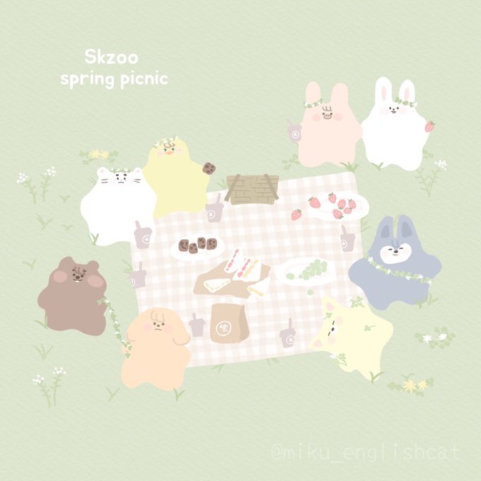 昨日の散歩に春を感じたので🍀🍀🍀 タンポポとペンペン草とクローバーが沢山生えてきてたよ🍀🍀🍀 みんなでピクニック🍓🥪🧋 #StrayKids #스트레이키즈 #Straykidsfanart