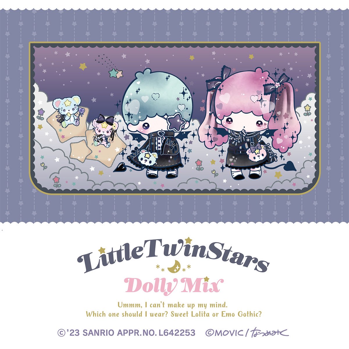 🖤🎀DOLLY MIXコラボご紹介🎀🖤 「EMO」バージョンのキキは星のカタチの アイマスクを付け、ララは髪の毛をツインテールに束ねて、ゴシックコーデを着て頂きました✴︎★✳︎ ダスティカラーの背景とマッチした2人にご注目ください🌙✨ #リトルツインスターズ #どーりーみっくす