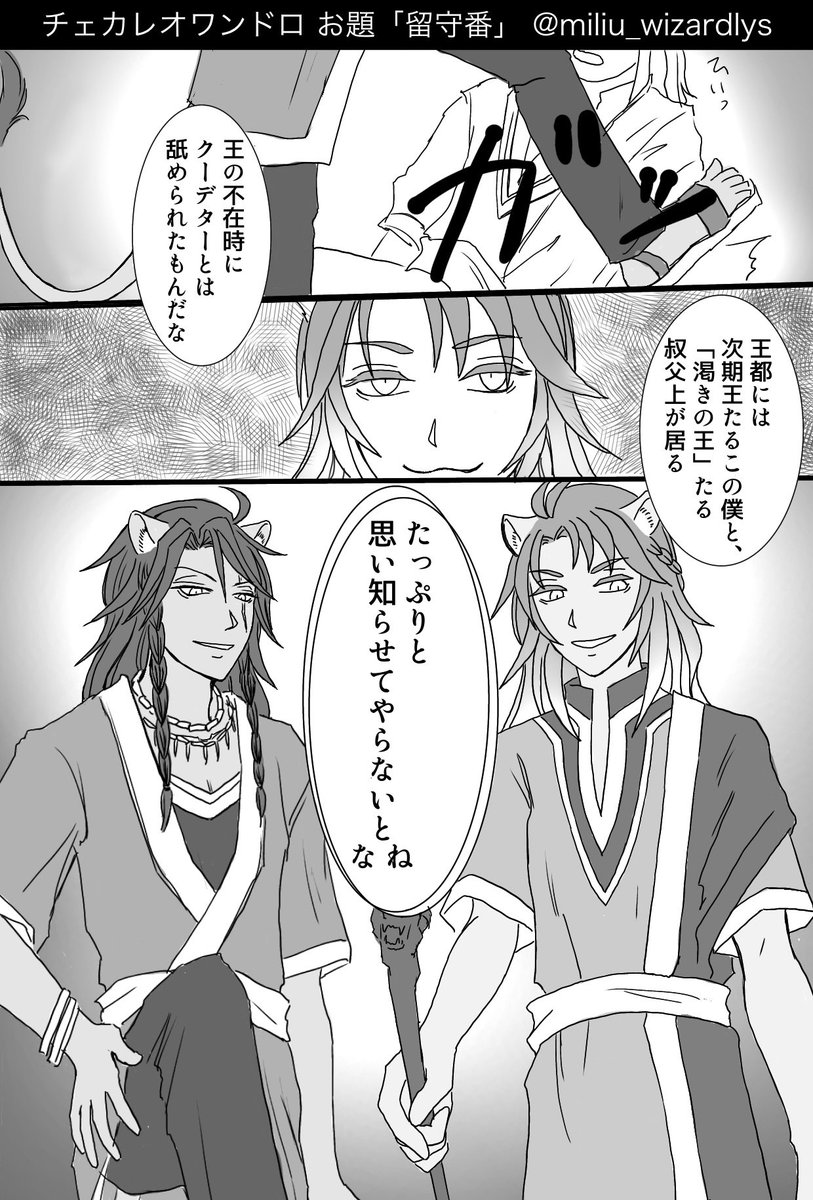 チェカレオ版ワンドロ・ワンライ 「留守番」 下描き+1.5h 渇きの王子とか王とか捏造ですが恐れられて言われてたのを皮肉ってる感じで何か欲しくてですね… #chekaleo_1draw @chekaleo_1draw