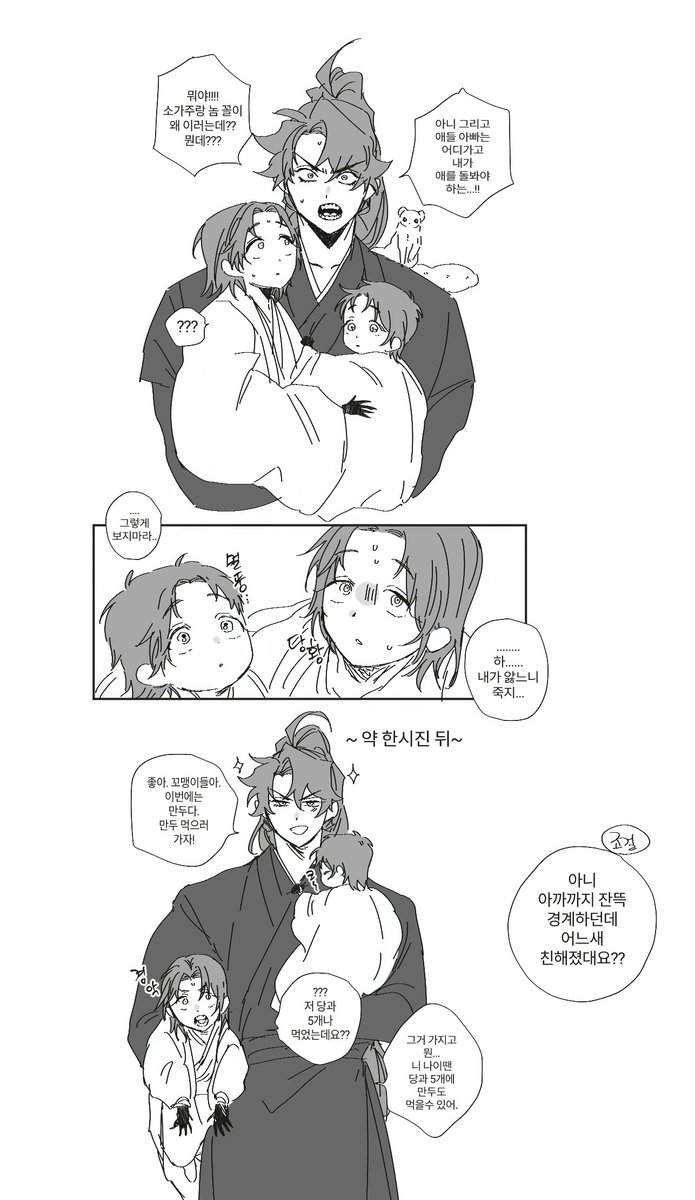 쌍존이 유랑 떠나기전에 각자 애기들에게 붙잡혔으면 좋겠다. 아이들은 의외로 눈치가 빠르기에 후회하기전에 여러 이유들로 붙잡으려 했겠지...