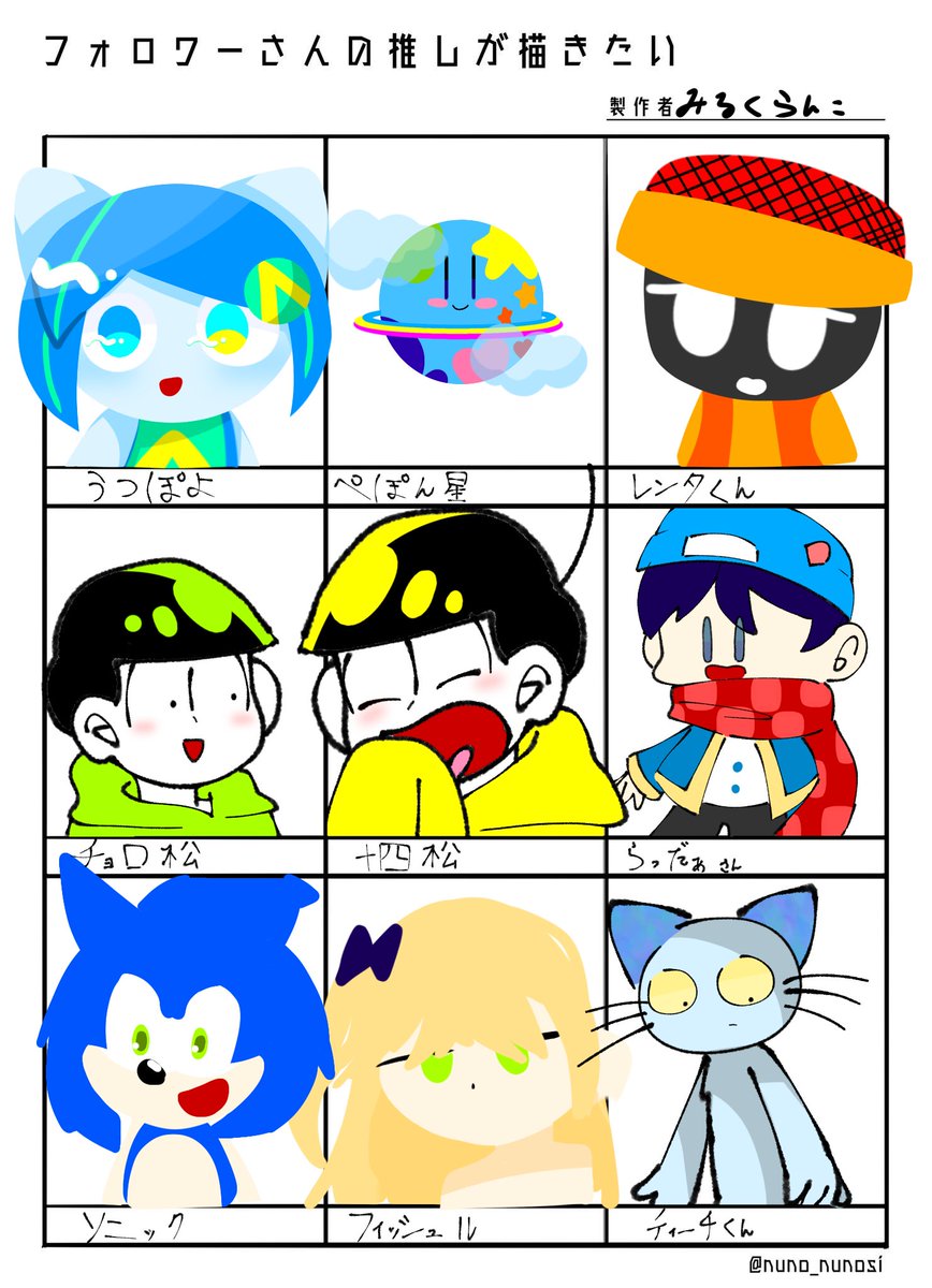 #今日中にフォロワー100人増やす見た人強制 #絵柄が好みっていう人にフォローされたい #イラスト練習中 増えたら…いいんだけどね… プロフィールにも描いてありますが plott、ティーチくん、Undertale、おそ松さん、ペぽよ様、東方、ポンクエ…等色々なものが好きで描いてます! 全周回します!