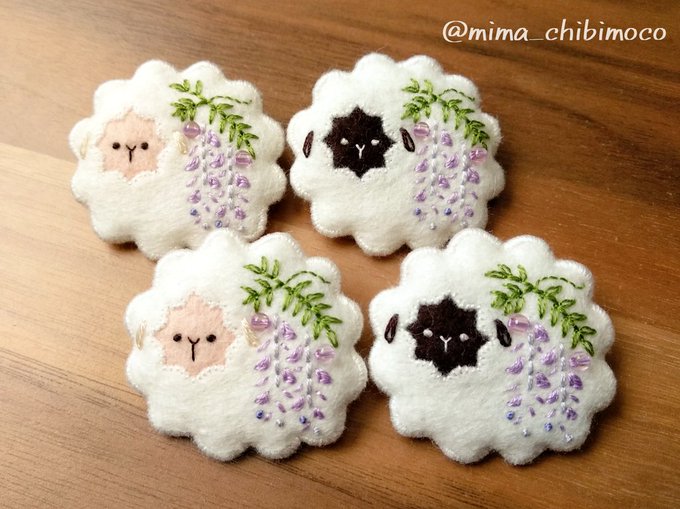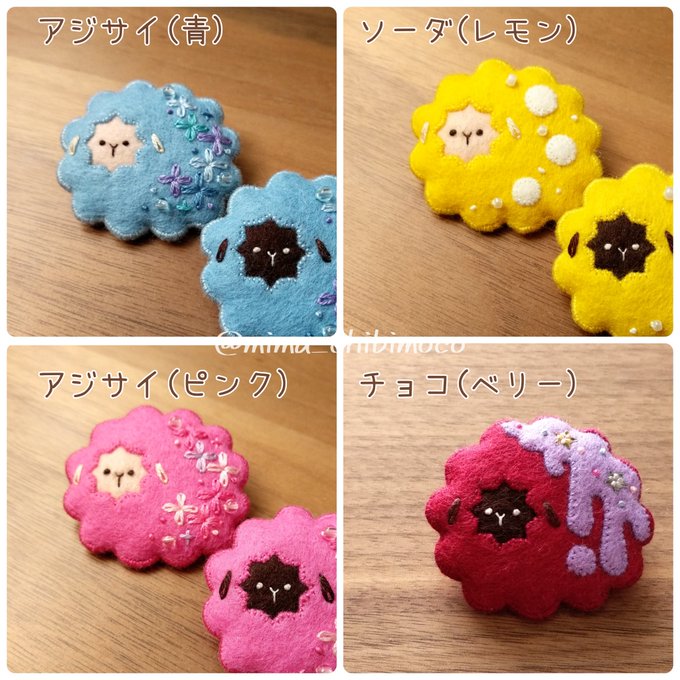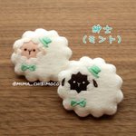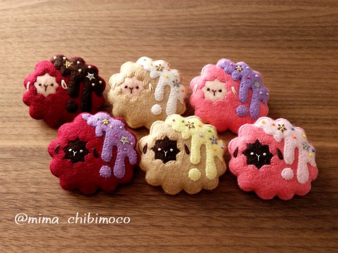 #私の世界観に触れて欲しい シートフェルトで、ちっちゃな羊の #ちびもこ さんのブローチを製作しています🐑 おめかし好きな羊さん達は、お花になってみたり、チョコレートがかかったお菓子になってみたり🐑 割と擬態好きなこも多いですね🤔