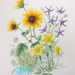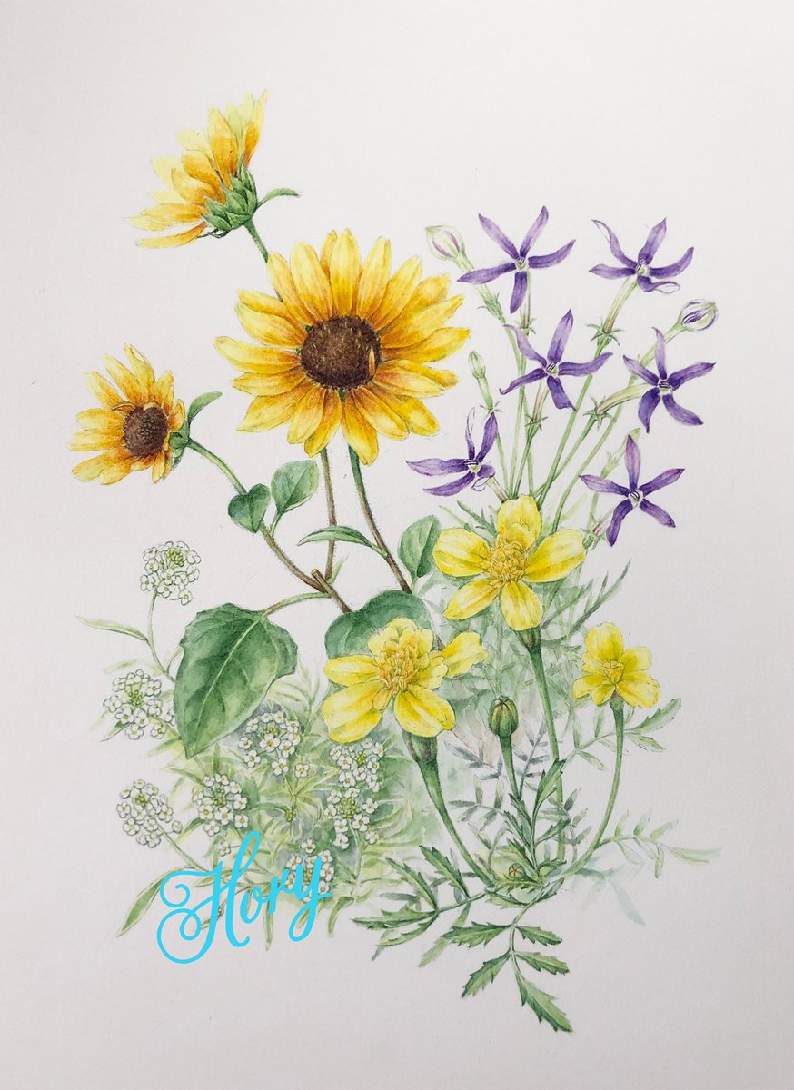 3 105 #ヒマワリ サンビリーバブル ブラウンアイガール <キク科> #マリーゴールド <キク科> #イソトマ <キキョウ科> #スーパーアリッサム フロスティナイト <アブラナ科> 初夏っぽいのを描いてみました😊 #ボタニカルアート #水彩画 #植物画 #花 #イラスト 21/06/20 11:53