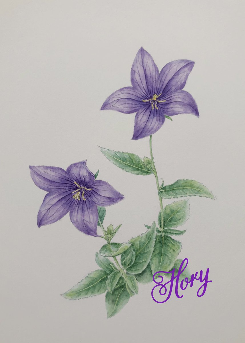 キキョウ <キキョウ科> 初めて クサカベのパーマネントバイオレットを使ってみました😊 濃くなり過ぎないように、涼しげな感じを目指してみました✨ #キキョウ #ボタニカルアート #水彩画 #植物画 #花 #イラスト