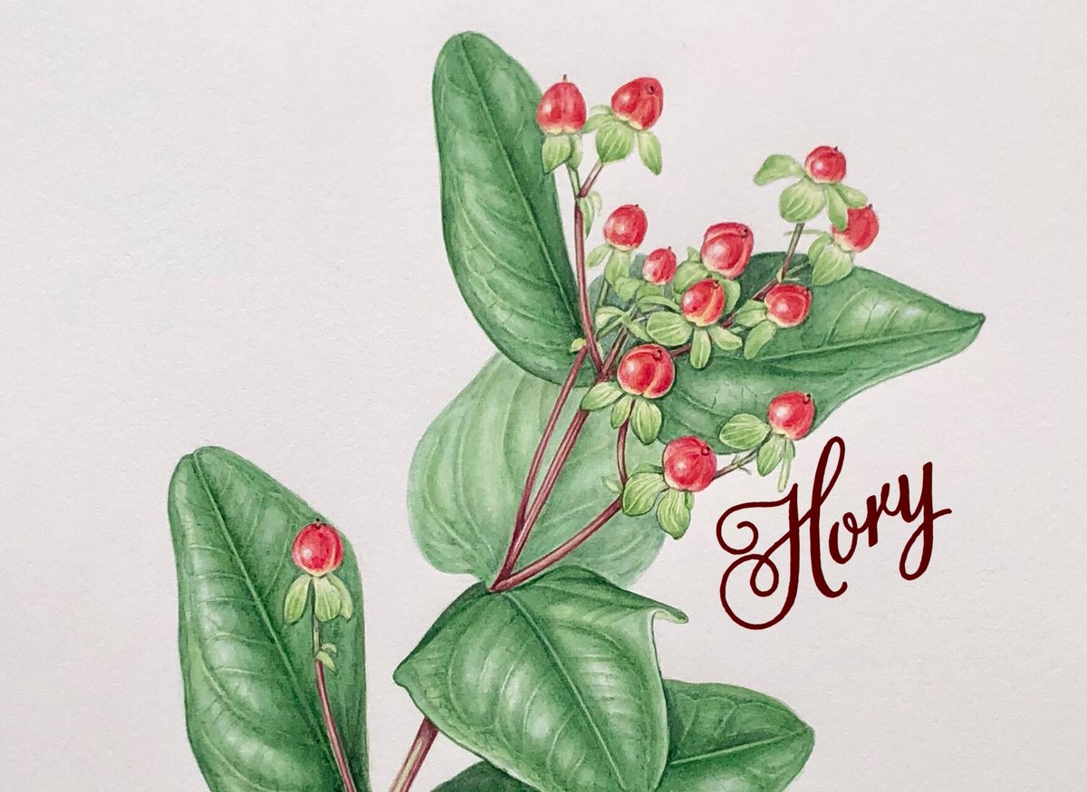 ヒペリカム (オトギリソウ科) 赤い実が可愛い💖 クリスマスっぽい植物はテンション上がりますね✨ #ヒペリカム #ボタニカルアート #水彩画 #植物画 #イラスト