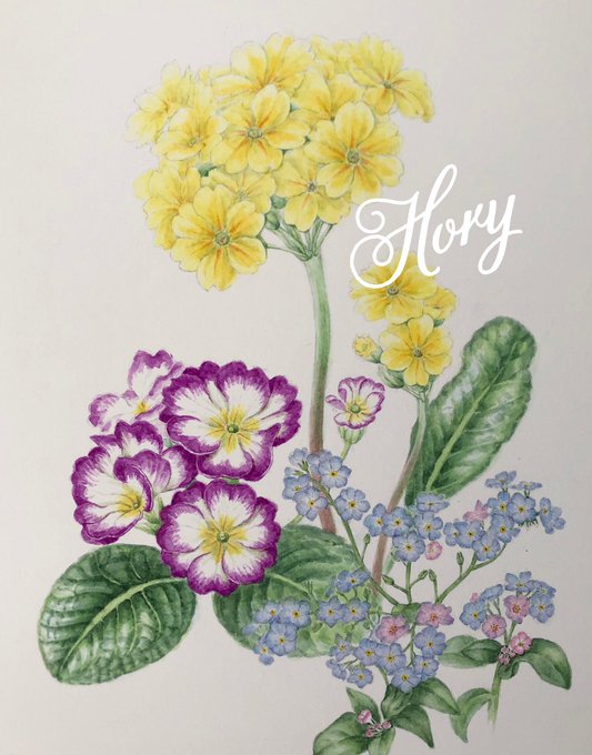 1 62 プリムラ アラカルトシュシュ プリムラ ジュリアン (サクラソウ科) ミオソティス ミオマルク[ワスレナグサ] (ムラサキ科) 構図苦手だけど あえて組み合わせて描くのにチャレンジしてみました😊 #プリムラ #ワスレナグサ #ボタニカルアート #植物画 #水彩画 #花 #イラスト 20/12/16 16:47