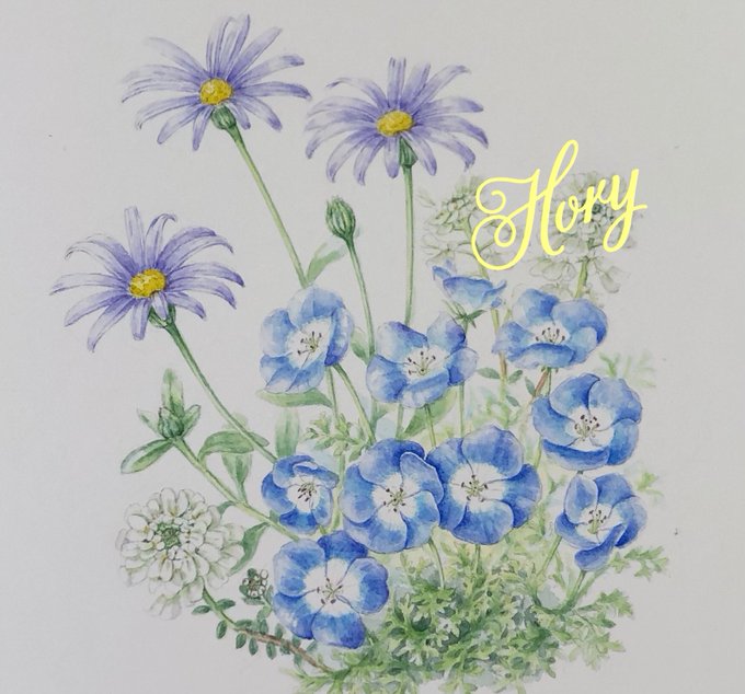 4 84 ネモフィラ (ムラサキ科) ブルーデージー フェリシア (キク科) イベリス ブライダルブーケ (アブラナ科) いつもよりサラッと描きました✨ 自分的には好きな仕上がり😊 #ネモフィラ #ブルーデージー #イベリス #ボタニカルアート #水彩画 #植物画 #花 #イラスト 21/02/19 13:01