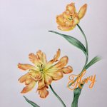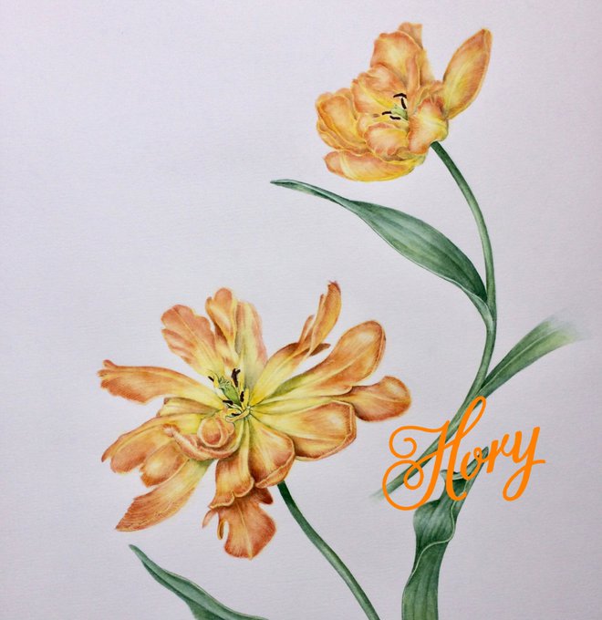 2 96 チューリップ モンテオレンジ (ユリ科) 本当は小さい方はつぼんでるのを描きたかったけど どんどん開いてしまった~😅 #チューリップ #ボタニカルアート #植物画 #水彩画 #花 #イラスト 21/03/23 18:48