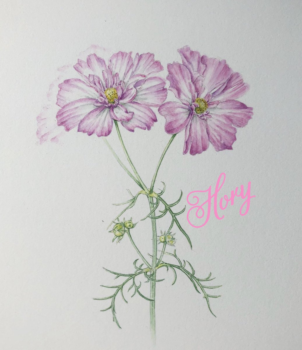コスモス ダブルクリックシリーズ <キク科> 八重咲きの可愛いコスモス描きました💕 #コスモス #ダブルクリック #ボタニカルアート #水彩画 #植物画 #花 #イラスト