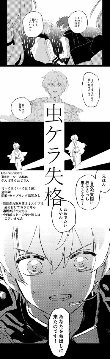 812 2773 3/21HARU COMIC CITY 30 ブリデ31告知 東6【あ53a】がんばろうおじさん 新刊 「虫ケラ失格」B5/70ページ 本家分家(桜河姉も出ます) 恋愛描写なし まだ本文途中なのでサンプル増えたら随時ツリーでつなげていきます 22/02/27 19:39