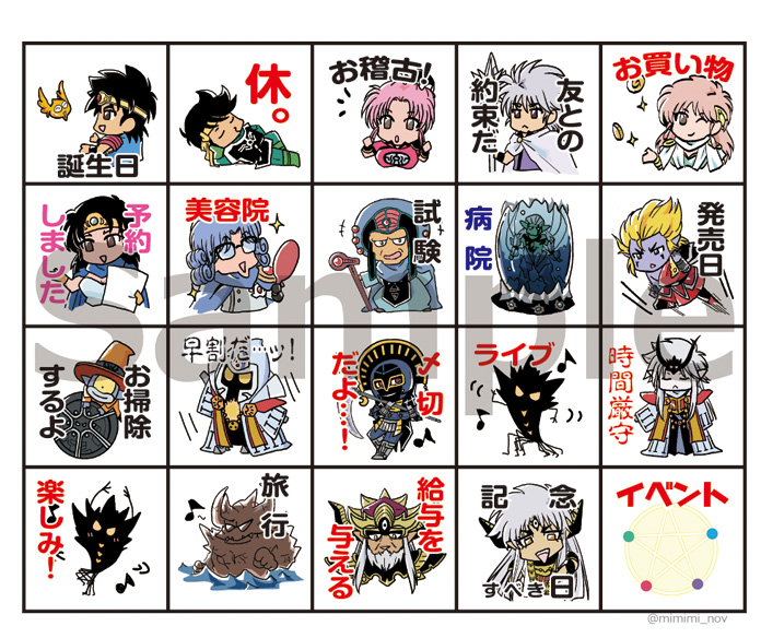 しにかげsummer用その2、スケジュールシールできました! これはサンプルに切り出してるので実物は1cm四方に各キャラ7~8枚をB6に貼った状態になります。いっぱい描きました!!