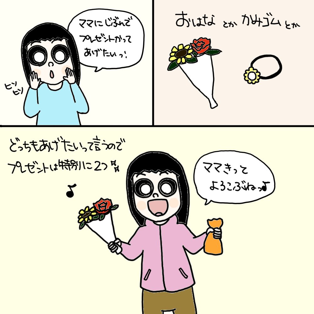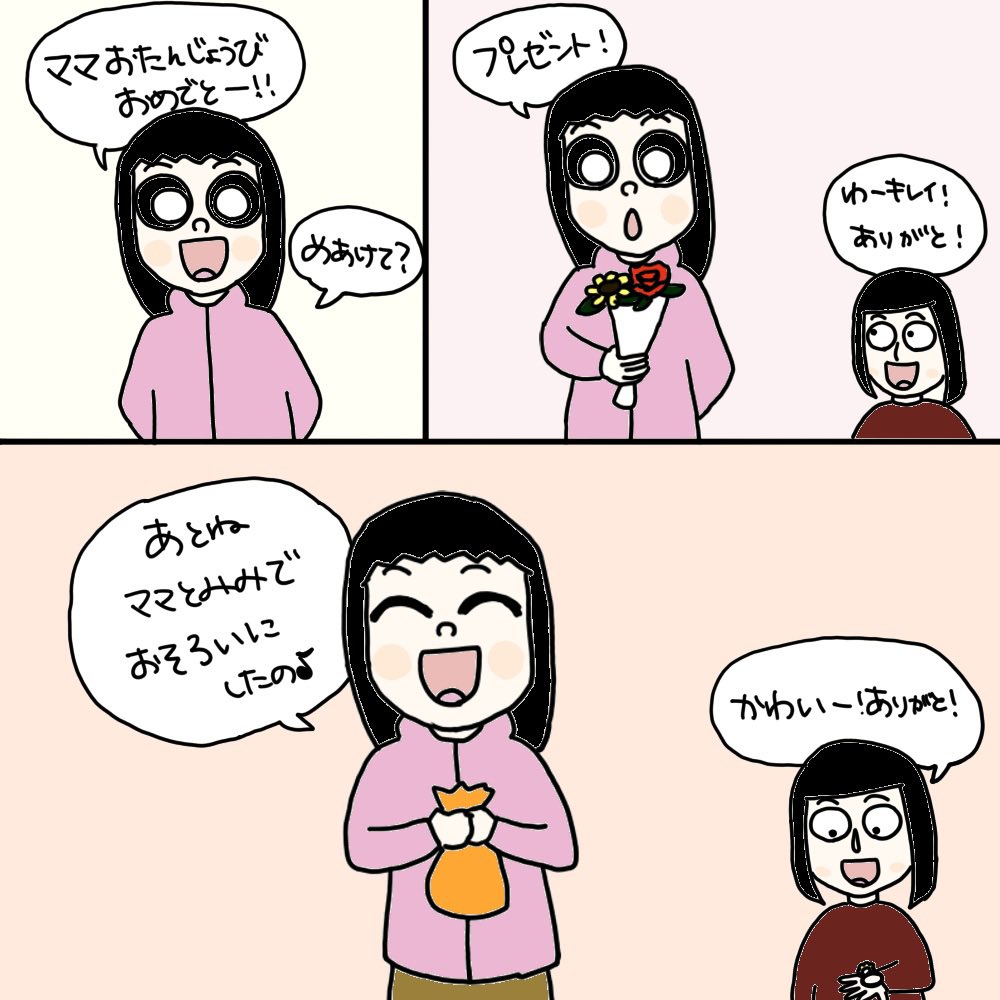 先日の妻の誕生日。みみが選んだプレゼント喜んでくれました!妻も少しなら歩いて散歩に行けるようになって、ママと一緒に出掛ける日は本当嬉しそうです♪ 誕生日おめでとー! #育児絵日記 #育児漫画 #イラスト #漫画が読めるハッシュタグ