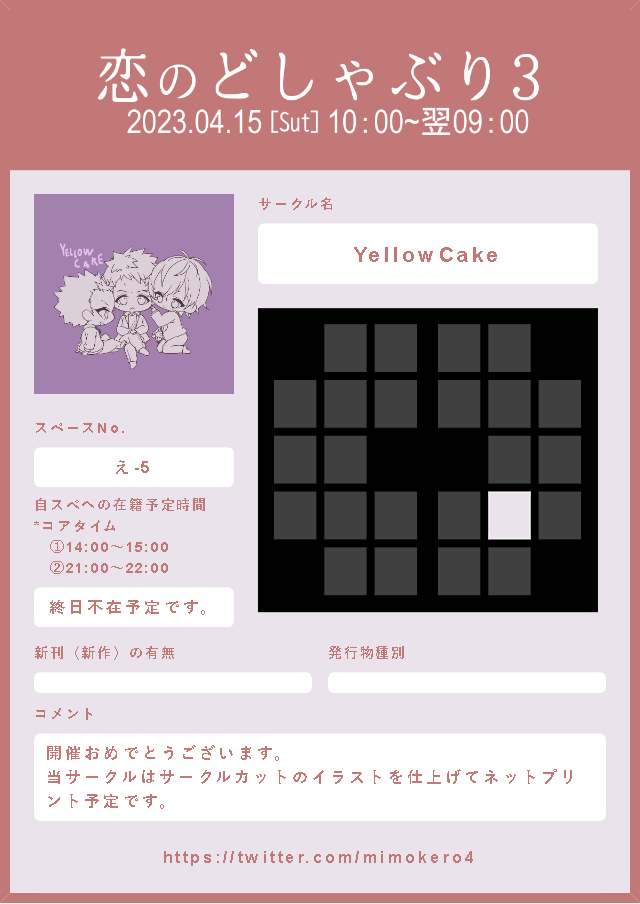 開催おめでとうございます。 758未成年に愛されひとや君が好きなんだなぁってアピールしたくて参加させていただきます。 サークルカットのイラストを仕上げてネップリ配布になります。 当日は大分⇔東京の移動とライブの為不在予定です。移動中に眺めに行きたいな…っ #7518webオンリー参加告知