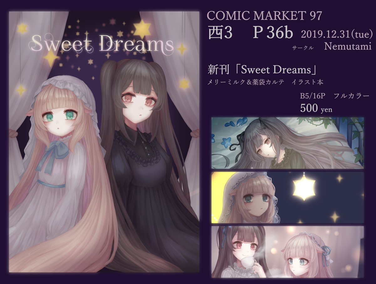 137 553 C97にて頒布する本のお品書きです! メリーミルクちゃんと薬袋カルテちゃんのイラスト本を出します 4日目12月31日(火)西3ホールP36bにてお待ちしております! 19/12/21 01:00