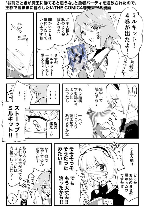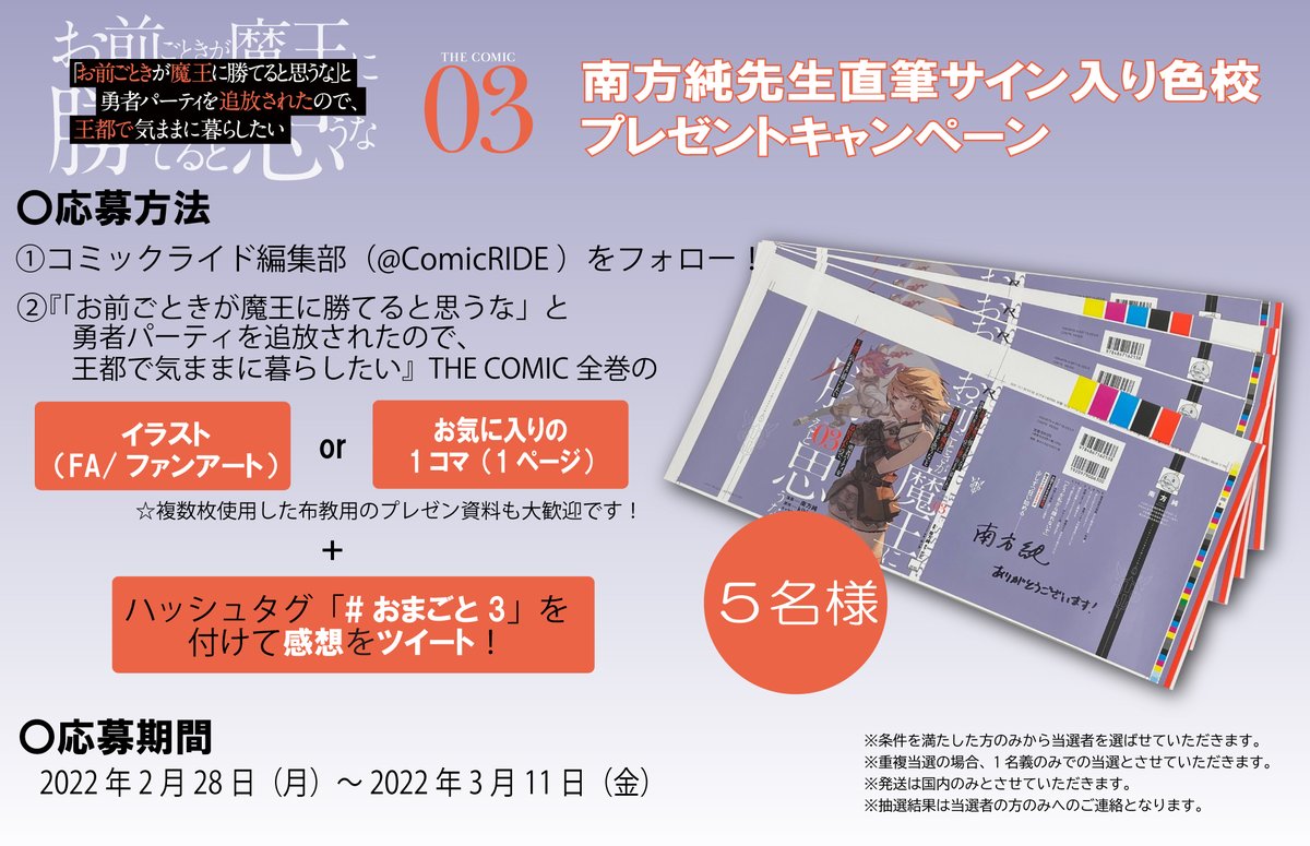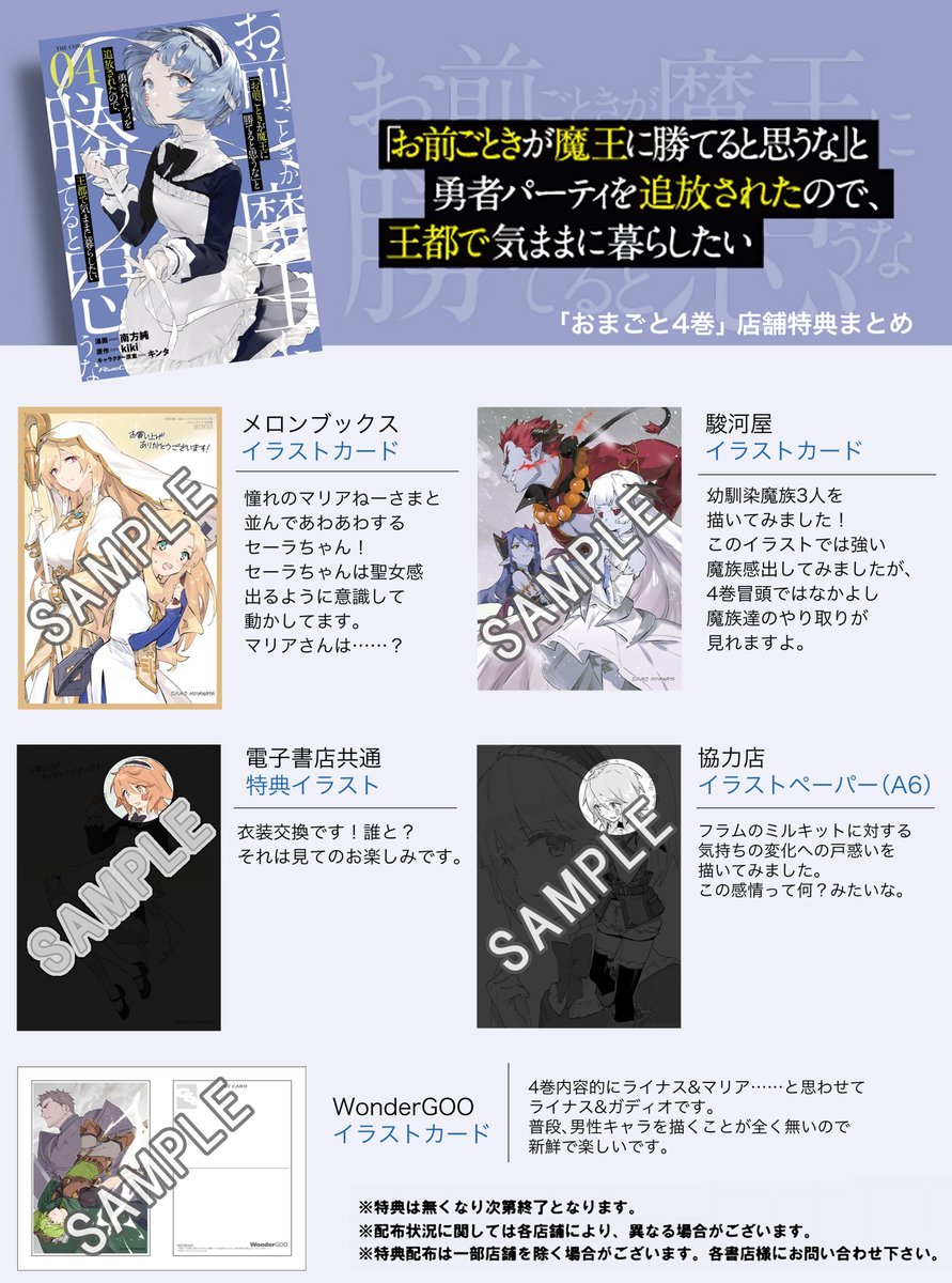『「お前ごときが魔王に勝てると思うな」と勇者パーティを追放されたので、王都で気ままに暮らしたい THE COMIC 4』出ます!特典描きました!よろしくお願いします!! comicride.jp/comics/news/n1… #おまごと