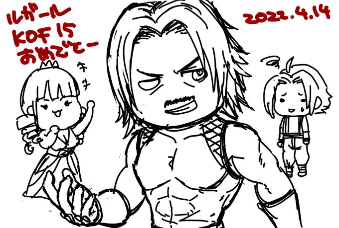 #KOFXVイラストコンテスト 一周年おめでとうございます! KOF15は前作からの様々なパワーアップはもちろんのこと、ルガールの復活がとても嬉しかったです。いっぱい喋ってくれるし相変わらずの傲慢さが健在で最高です!! 復活のR 〜with歴代主人公を添えて〜