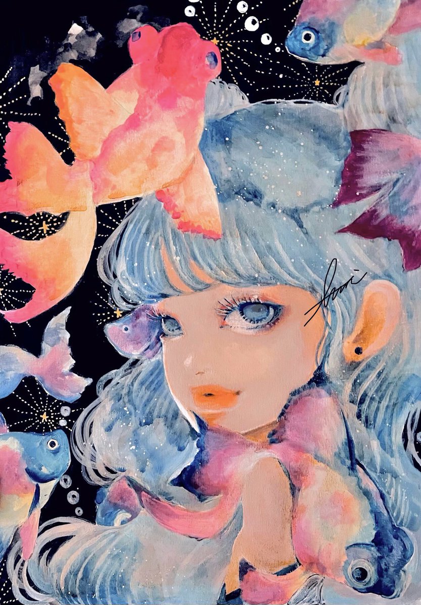 36 379 アクリル 金魚と花火 #アナログイラスト #イラスト #女の子イラスト #イラスト練習中 22/07/30 12:26