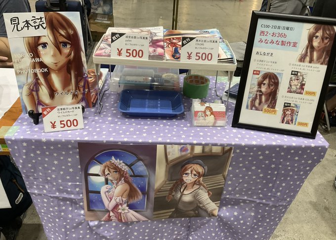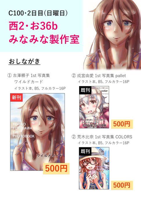 C100 8/14 西 お36b みなみな製作室 お品書きになります! 古澤頼子のフルカラーイラスト本と、過去に頒布したイラスト本をご用意しています よろしくお願いします!