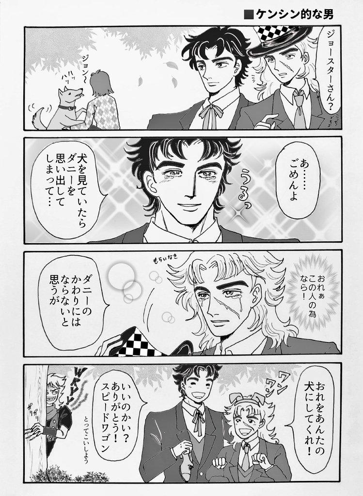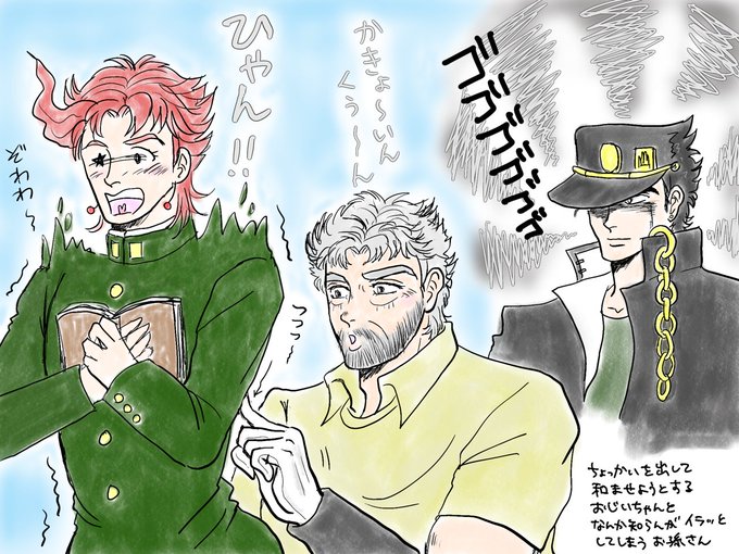 いづしさん(@idushishi) の、SPWおじいちゃんの背中を《つつ~👆》とするジョセフがめちゃめちゃ可愛くて💗 きっと年をとってもやってるだろうな⋯主な被害者は典くんだろうな🤭という落書きです😆 twitter.com/idushishi/stat…