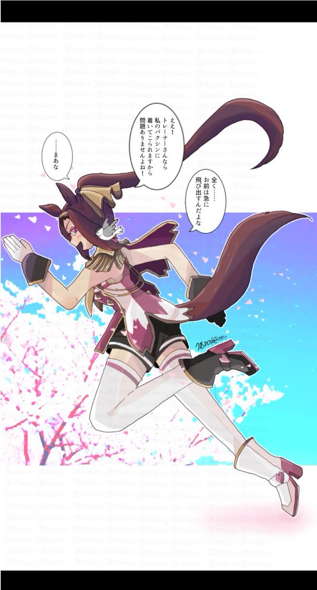 3 13 @nokogara 大好きなトレーナーこがらさんと驀ちゃんのファンアートを描かせていただきました。勝手にすみません。 これからも応援してます✨ 23/04/25 22:52