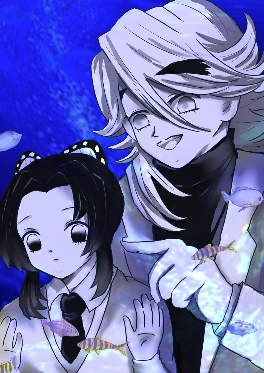 #童しの版深夜の真剣お絵描き60分一本勝負 お題「水族館」 1ドロ+20分 放課後、勉強の息抜きにと水族館に来たjk×詐欺師 段々満更でもなくなってきたしのちゃん。隣でずっと話してるけど魚に夢中で聞いてないしのちゃん。