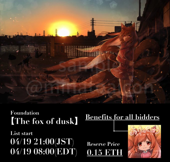 「The fox of dusk」 04/19 21:00(JST) LIST Check out this NFT by @minatoaicon on @foundation ! 🌐 foundation.app/@SatsukiMinato… 🦊We will give all bidders a stamp of the fox character "Yuhi"!🦊 #NFT #NFTart #NFTCommunity