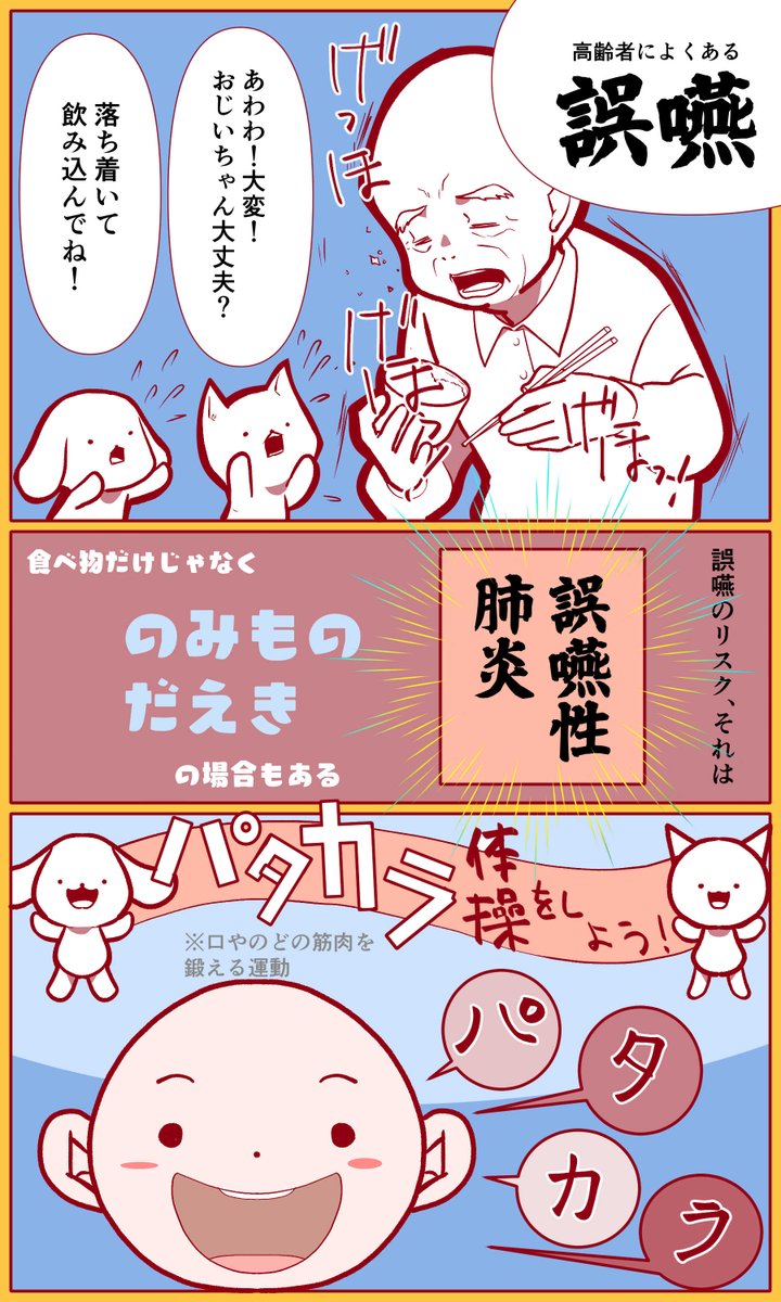 誤嚥について新しく学びました! 【「パタカラ」体操】 って知ってる??? @ccb_nk 先生に教えてもらいました! 参考:mcsg.co.jp/kentatsu/kaigo… 高橋幸宏の死因にもなった誤嚥ですが、過去にはラッシャー木村さんのようなムキムキの方も。マッチョだったろうに…