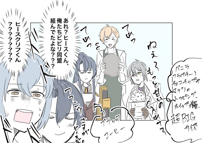 これは今日のログストで凝り性が発動し、スタ◯店員みたくなったヒースと、謎の焦りに見舞われるネロ・ターナー #まほやく_FA