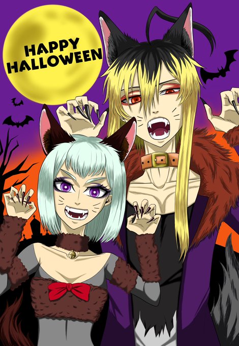 19.オリジナルキャラクター 左.繋 (つなぐ) 右.藤花(とうか) Happy Halloween‼︎ 「ガオー‼︎」 #オリジナルキャラクター #ハロウィンイラスト #絵描きさんと繋がりたい
