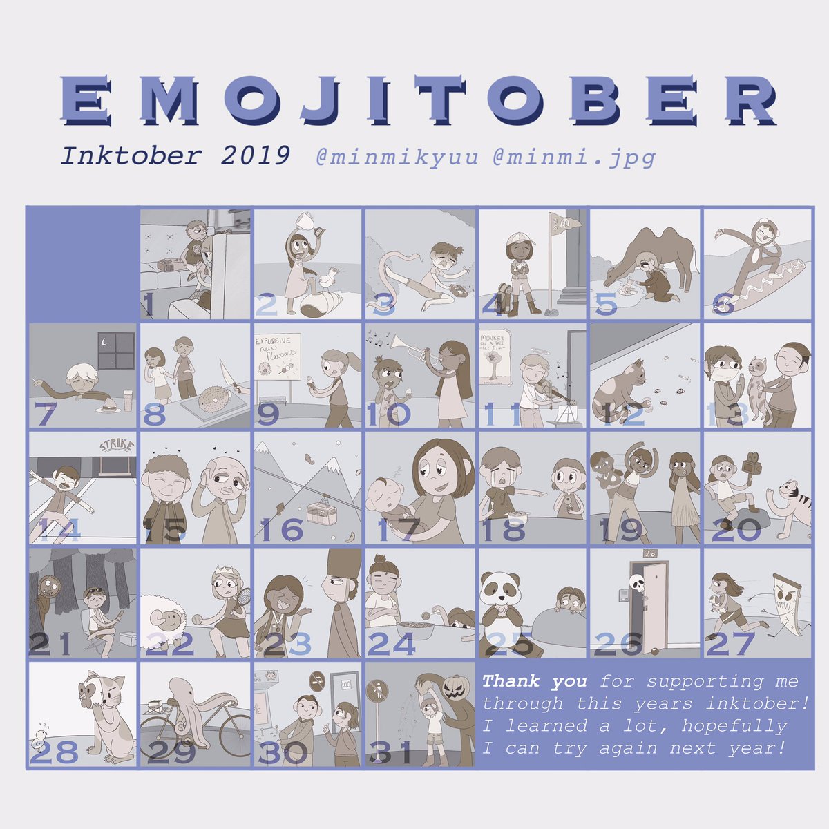 #Inktober is officially over!! It's the third year I manage to finish inktober and I'm super proud of myself, I did my best and this helped me in ways I did not expect! I'd love to know which drawings are you favourite ones 🧡 #emojitober #Inktober2019
