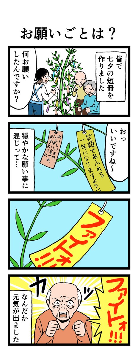 😳「願い事」 七夕になると利用者の皆さんで短冊に願いを込めます。 思わず笑ってしまった「願い」とは…?! 原作:介護福祉士・こはるさん @koha_kaigo マンガ:オカトマトさん @tomatokeikakuan #マンガが読めるハッシュタグ #みんなの介護 job.minnanokaigo.com/news/4koma-man…