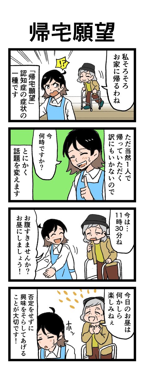 😳「帰宅願望」 施設に来たばかりなのに帰宅しようとする利用者さん。 こはるさんのかけた言葉は…?! 原作:介護福祉士・こはるさん @koha_kaigo マンガ:オカトマトさん @tomatokeikakuan #マンガが読めるハッシュタグ #みんなの介護 job.minnanokaigo.com/news/4koma-man…