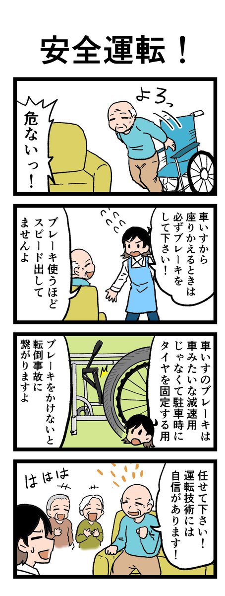 😳「安全運転!」🙂 車椅子で大事なのは安全運転よりも安全駐車?! 駐車用ブレーキをかけ忘れてしまうと… 原作:介護福祉士・こはるさん @koha_kaigo マンガ:オカトマトさん @tomatokeikakuan #マンガが読めるハッシュタグ #みんなの介護 job.minnanokaigo.com/news/4koma-man…