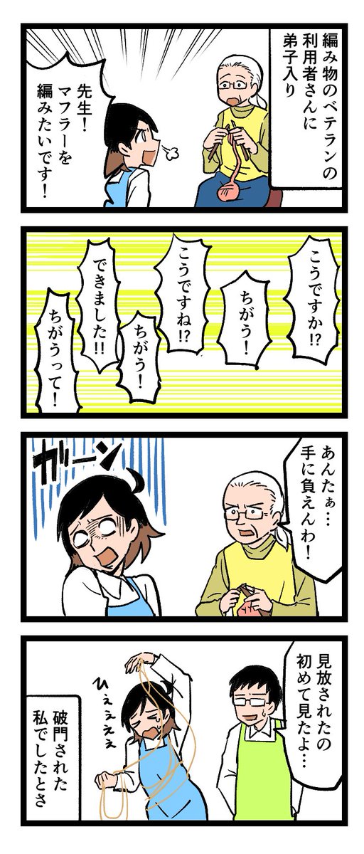 最新話!介護現場がわかる4コママンガ😄 「編み物講座」 「介護する側が”教わる”」ことも、実はたくさんあるんです job.minnanokaigo.com/news/4koma-man… 原作:介護福祉士・こはるさん @koha_kaigo マンガ:オカトマトさん @tomatokeikakuan #みんなの介護 #マンガが読めるハッシュタグ