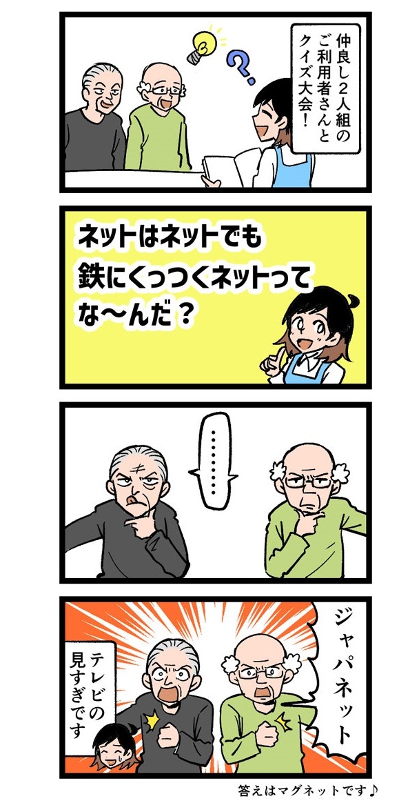 介護現場での“ほっこりエピソード”😄 「クイズ大会」の一場面を四コママンガ化! レクでのコミュニケーションのヒントが詰まっています💛 原作:介護福祉士・こはるさん @koha_kaigo マンガ:オカトマトさん @tomatokeikakuan #マンガが読めるハッシュタグ job.minnanokaigo.com/news/4koma-man…
