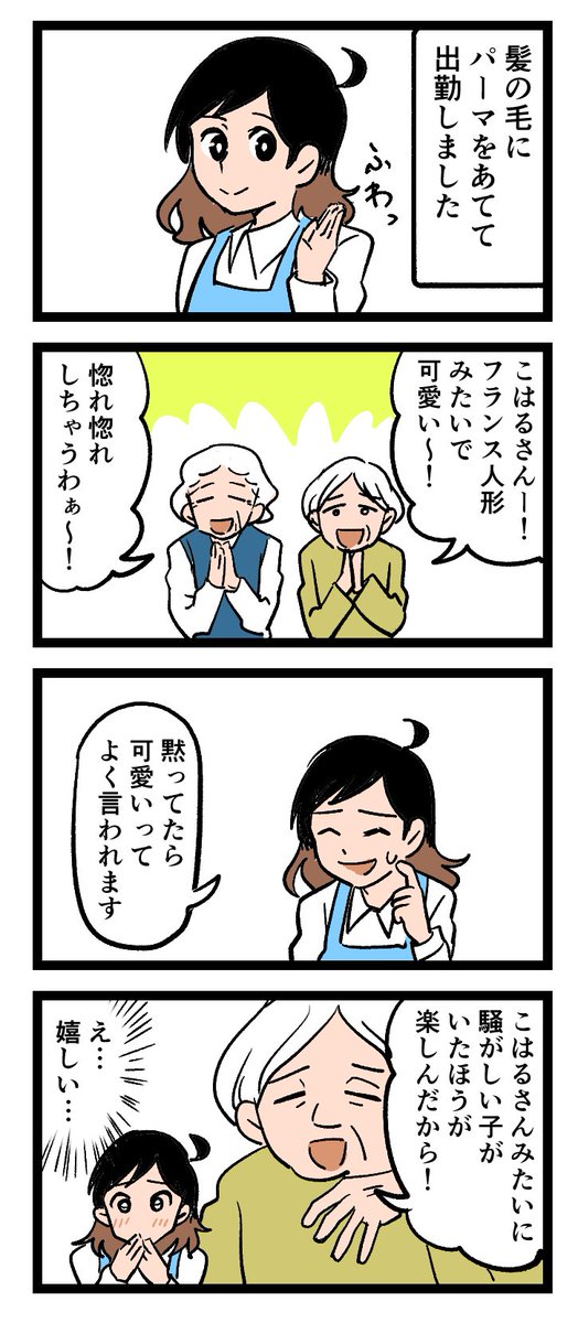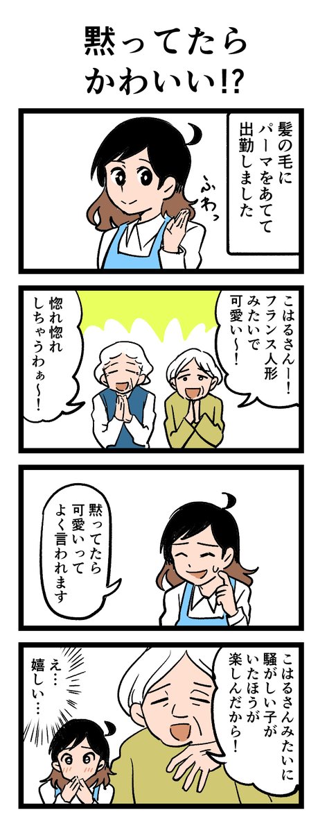 介護現場がわかる4コママンガ😄 「黙ってたら かわいい?」 今回のテーマは「働く皆さんと入居者の方のコミュニケーションの気付き」 job.minnanokaigo.com/news/4koma-man… 原作:介護福祉士・こはるさん @koha_kaigo マンガ:オカトマトさん @tomatokeikakuan #みんなの介護 #マンガが読めるハッシュタグ