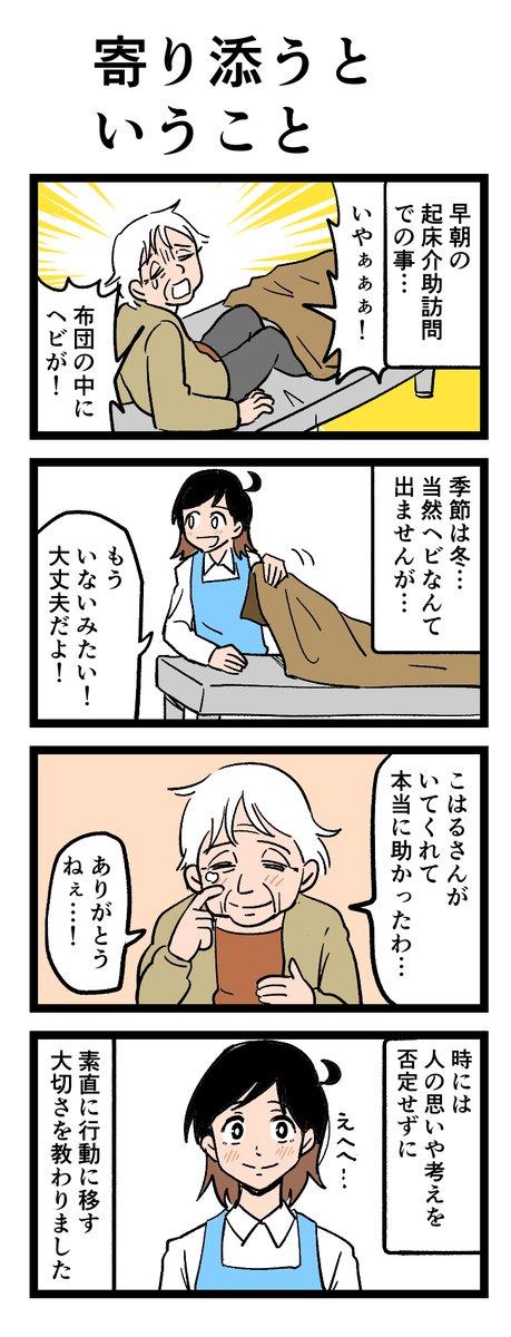 🧓困った利用者さんが頼ってくれて…😍 「布団の中にヘビが!」 早朝の起床介助訪問で、利用者さんがいきなり叫んで…⁉ 原作:介護福祉士・こはるさん @koha_kaigo マンガ:オカトマトさん @tomatokeikakuan #マンガが読めるハッシュタグ job.minnanokaigo.com/news/4koma-man…