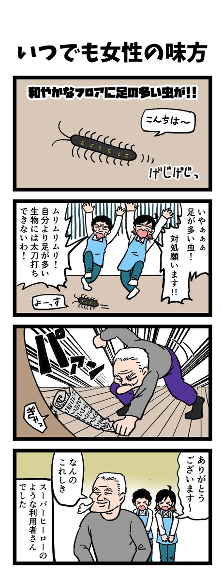 🐛足の多い虫が現れたときにヒーローが⁉👴 ピンチに颯爽と現れた利用者さんがとった行動は⁉ 原作:介護福祉士・こはるさん @koha_kaigo マンガ:オカトマトさん @tomatokeikakuan #マンガが読めるハッシュタグ #みんなの介護 job.minnanokaigo.com/news/4koma-man…