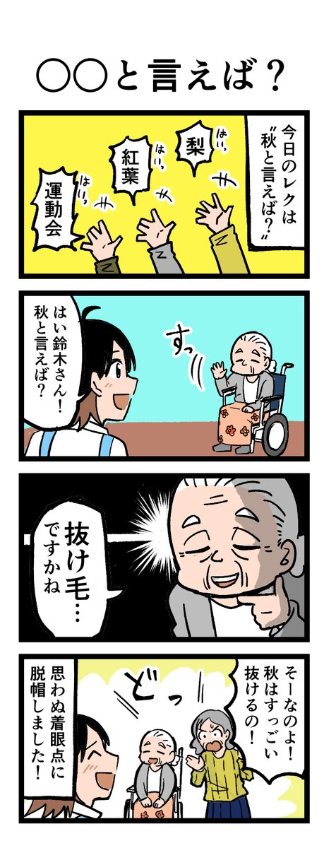 四季から連想するものは?😄 連想ゲームのレクでの一場面 利用者の方から思いがけぬ答えが…⁉ 原作:介護福祉士・こはるさん @koha_kaigo マンガ:オカトマトさん @tomatokeikakuan #マンガが読めるハッシュタグ #みんなの介護 job.minnanokaigo.com/news/4koma-man…
