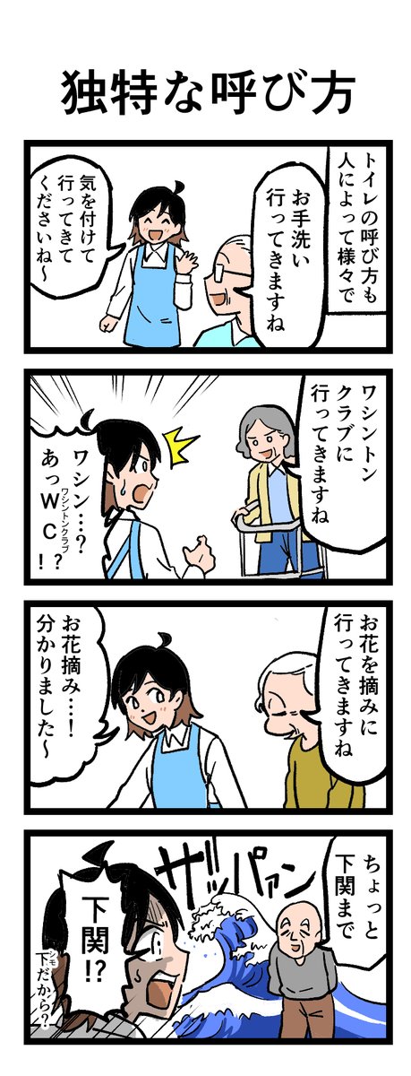 🚻トイレの「教養」❓ 皆さんは「お手洗いに行ってきます」でしょうか? ですが、実は様々な呼び方があるんですよ 原作:介護福祉士・こはるさん @koha_kaigo マンガ:オカトマトさん @tomatokeikakuan #マンガが読めるハッシュタグ #みんなの介護 job.minnanokaigo.com/news/4koma-man…