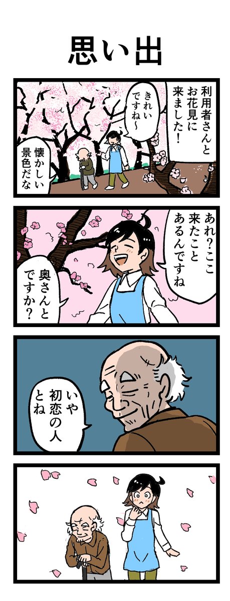 🌸桜を見ると思い出が溢れてきて…🌸 「お花見、誰と来たんですか?」 入居者の方は思わずときめく一言を⁉ 原作:介護福祉士・こはるさん @koha_kaigo マンガ:オカトマトさん @tomatokeikakuan #マンガが読めるハッシュタグ #みんなの介護 job.minnanokaigo.com/news/4koma-man…