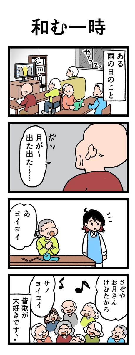 🗣みんなで歌うのは、やっぱり楽しい😊 「月が~出た出た~」 とある雨の日、1人の入居者の方は呟くと…⁉ 原作:介護福祉士・こはるさん @koha_kaigo マンガ:オカトマトさん @tomatokeikakuan #マンガが読めるハッシュタグ #みんなの介護 job.minnanokaigo.com/news/4koma-man…