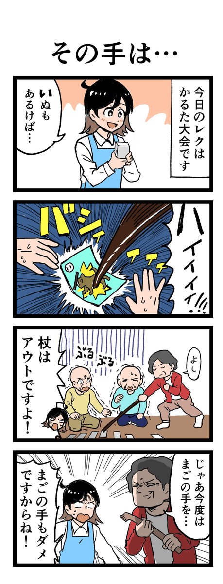 😀かるた大会でまさかの手❓ 「いぬも歩けば…」 かるた大会で予想外の「手」が出てきて…⁉ 原作:介護福祉士・こはるさん @koha_kaigo マンガ:オカトマトさん @tomatokeikakuan #マンガが読めるハッシュタグ #みんなの介護 job.minnanokaigo.com/news/4koma-man…