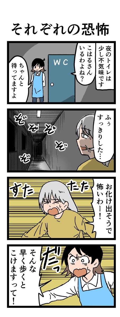 🚾夜のトイレはやっぱり怖い😱 「お化けが出そう!」 入居者の方はそう言うが、こはるさんはそれよりも怖いものが⁉ 原作:介護福祉士・こはるさん @koha_kaigo マンガ:オカトマトさん @tomatokeikakuan #マンガが読めるハッシュタグ #みんなの介護 job.minnanokaigo.com/news/4koma-man…
