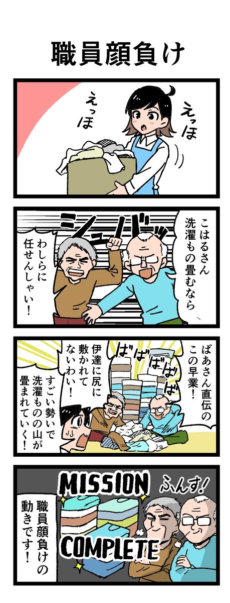 😳職員顔負けの技術とスピード💪 「洗濯ものは任せなさい!」 入居者の方が洗濯ものを畳むのを手伝ってくれ…⁉ 原作:介護福祉士・こはるさん @koha_kaigo マンガ:オカトマトさん @tomatokeikakuan #マンガが読めるハッシュタグ #みんなの介護 job.minnanokaigo.com/news/4koma-man…