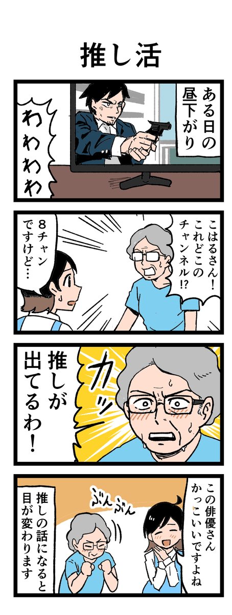 💞推しの話になると目が変わる❓ 「これどこのチャンネル?」 入居者の方が目を輝かせて聞いてきて… 原作:介護福祉士・こはるさん @koha_kaigo マンガ:オカトマトさん @tomatokeikakuan #マンガが読めるハッシュタグ #みんなの介護 job.minnanokaigo.com/news/4koma-man…
