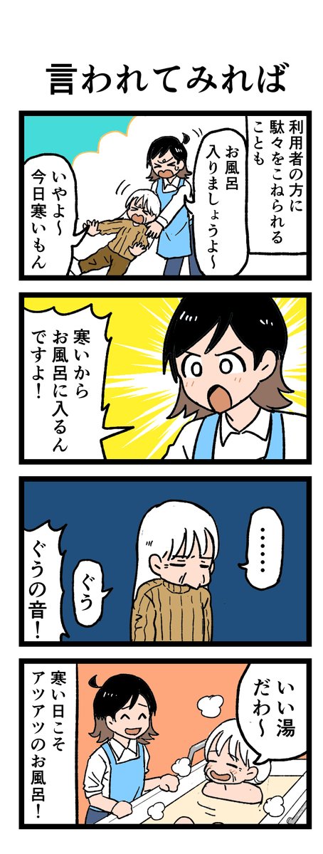 😳寒い冬こそお風呂♨でも… 「寒いから入りたくない」 お風呂は温まるところなのに、今日は寒いから入りたくない…⁉ 原作:介護福祉士・こはるさん @koha_kaigo マンガ:オカトマトさん @tomatokeikakuan #マンガが読めるハッシュタグ #みんなの介護 job.minnanokaigo.com/news/4koma-man…