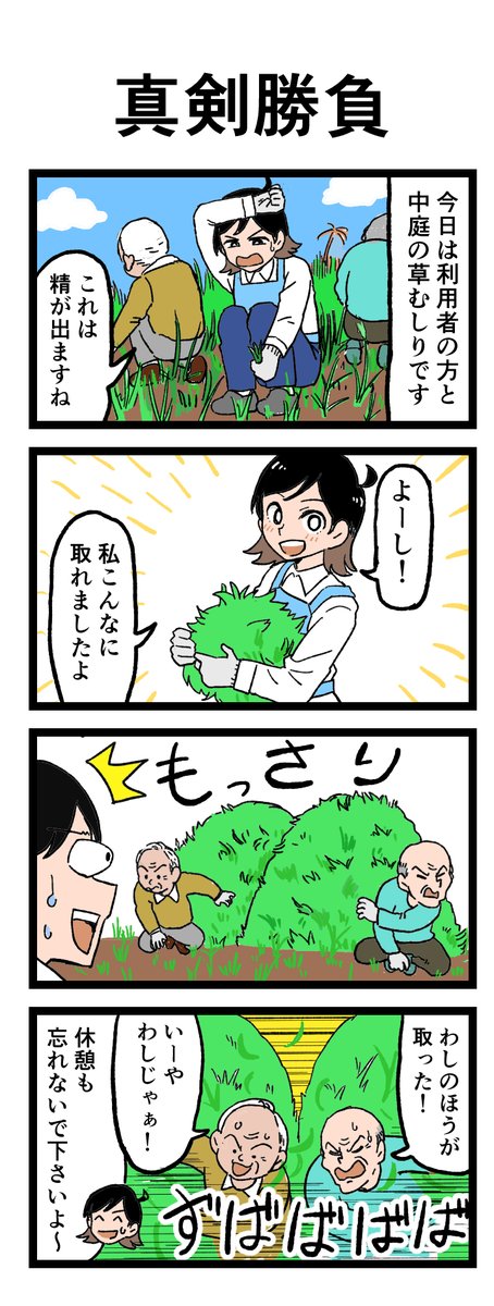 😳今日はみんなで草むしり…からの真剣勝負勃発?! 「真剣勝負」 中庭の伸びた草を手分けしてお手入れと思いきや…⁉ 原作:介護福祉士・こはるさん @koha_kaigo マンガ:オカトマトさん @tomatokeikakuan #マンガが読めるハッシュタグ #みんなの介護 job.minnanokaigo.com/news/4koma-man…