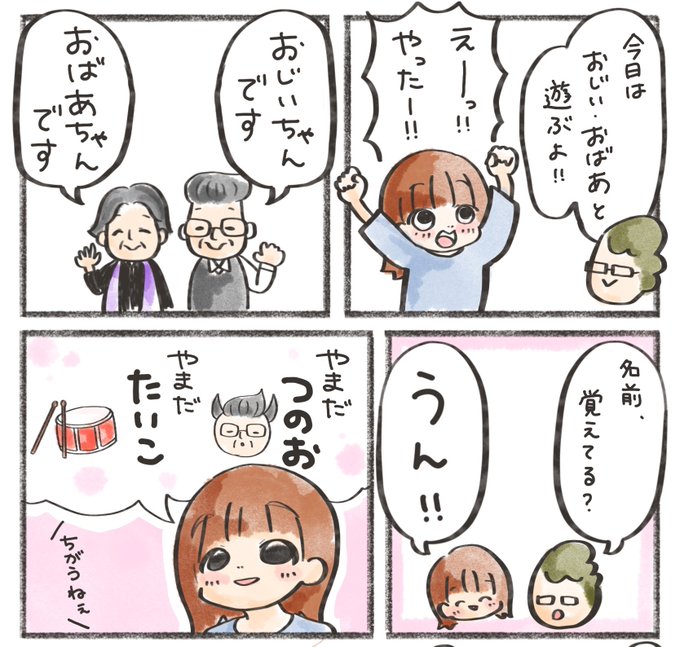 旦那側の曽祖父、曽祖母が娘とよく遊んでくれるのですが 名前を覚えるの苦手な娘 例に漏れず、家族でも覚えられません🙂 頑張れ……… #育児漫画 #育児絵日記